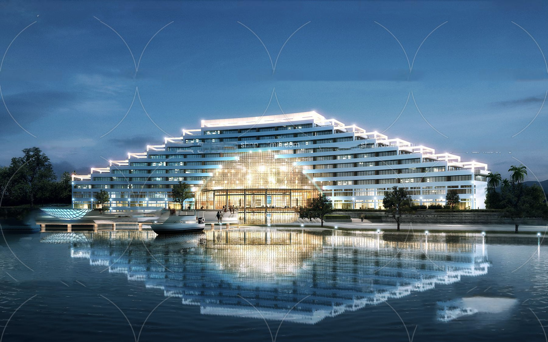 The central glass atrium serves as the focal point, welcoming visitors with warmth and elegance. The integration of water features, including the surrounding lake and reflective pools, amplifies the sense of serenity and luxury. The marina and dock area further enhance its appeal, offering functionality alongside aesthetics.