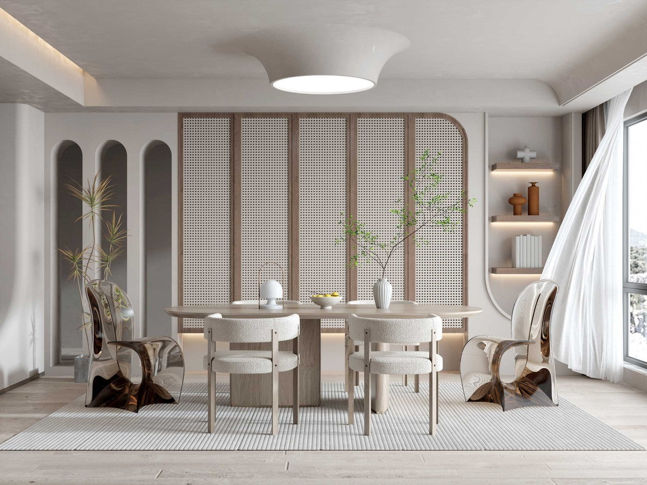 Arcane Serenity Dining features a contemporary fusion of organic forms and modern minimalism. The arched details on the wall, paired with the rattan-inspired textures, create a dynamic yet soothing backdrop. The neutral palette is complemented by bold metallic chairs with fluid forms, adding a statement of modern luxury.