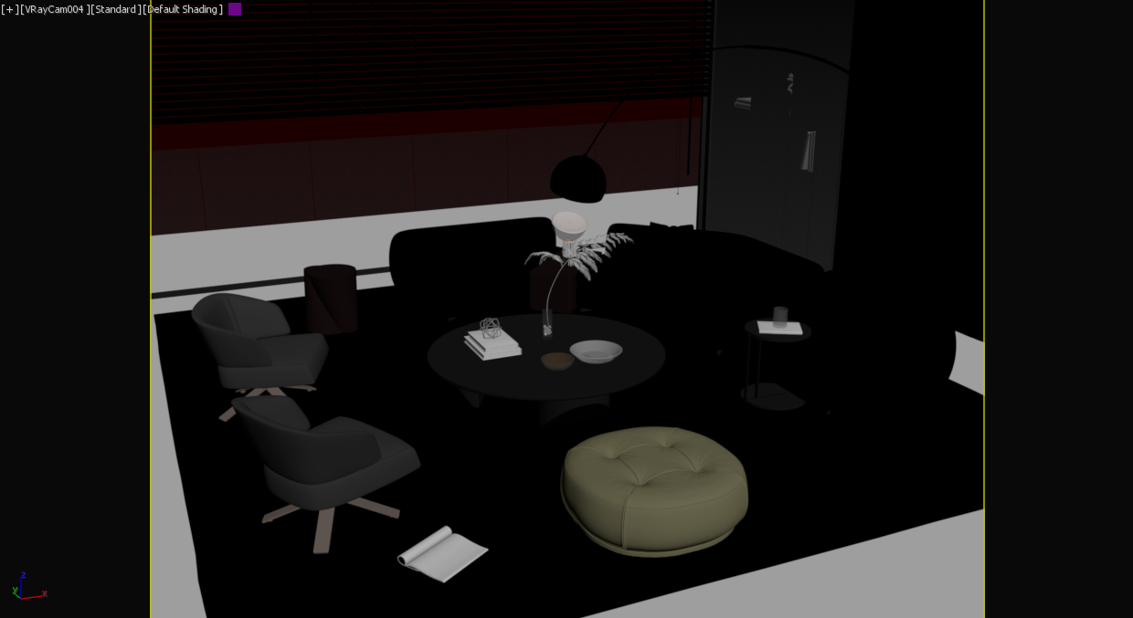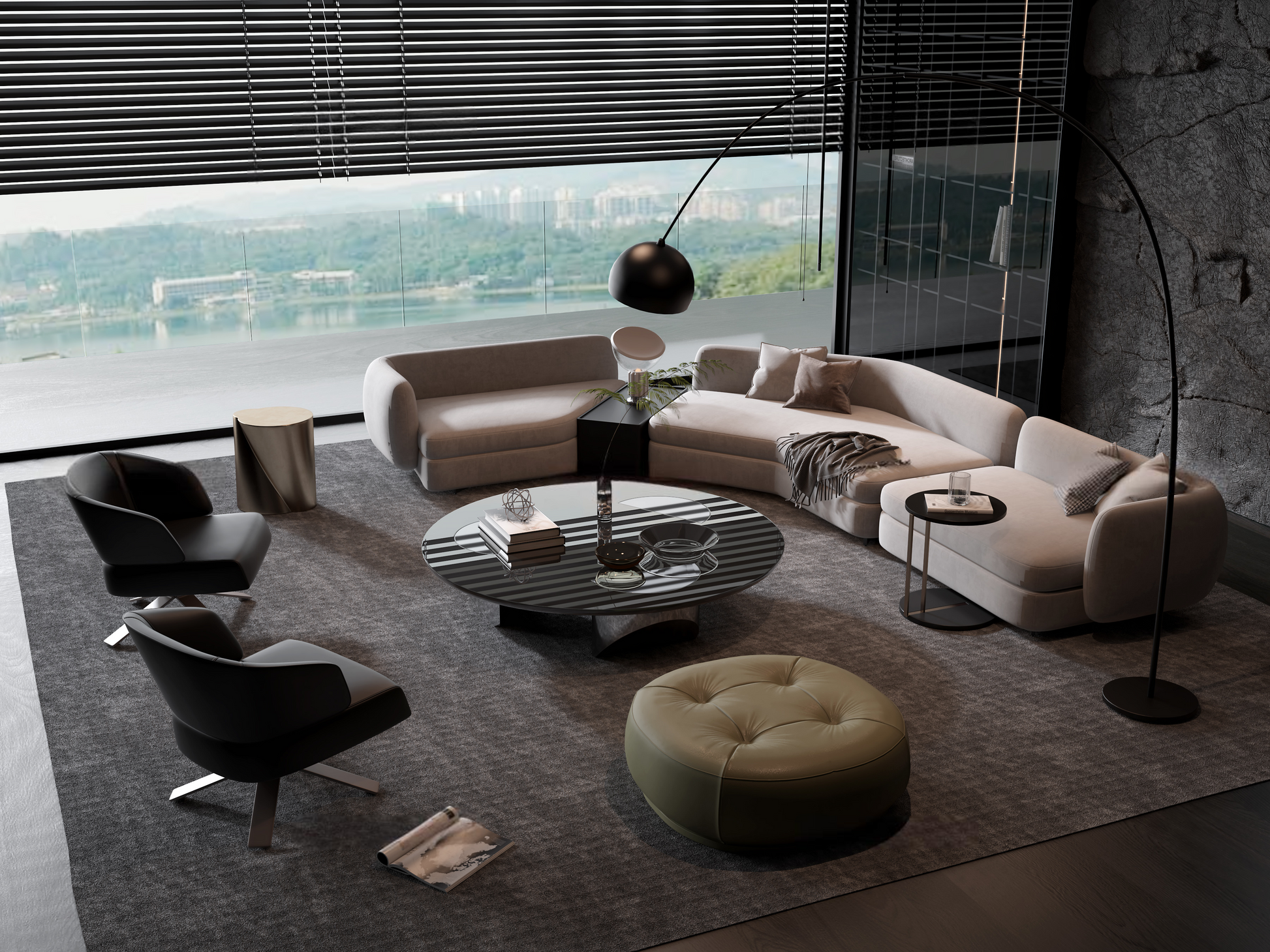 Opposite, two obsidian-black lounge chairs, poised with quiet confidence, add a sculptural contrast—balancing softness with structural integrity. Between them, a circular glass-topped coffee table with a striated black-and-white base reflects the shifting daylight, its polished surface echoing the vast expanse of sky mirrored in the water beyond. A small olive-green leather ottoman, subtly placed, introduces a muted organic tone, harmonizing with the deep slate-gray area rug beneath, which anchors the entire composition.