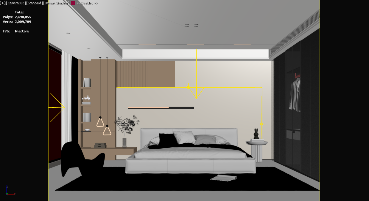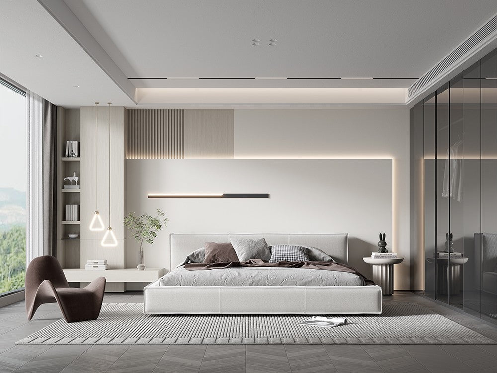 Etherea Somnus is a tranquil space where modern elegance meets ethereal minimalism. The neutral tones of the bed and walls establish a calm foundation, while the floating bedside tables and sleek pendant lighting elevate the room's contemporary appeal. Linear lighting on the wall creates a halo-like effect, adding depth and a sense of serenity.