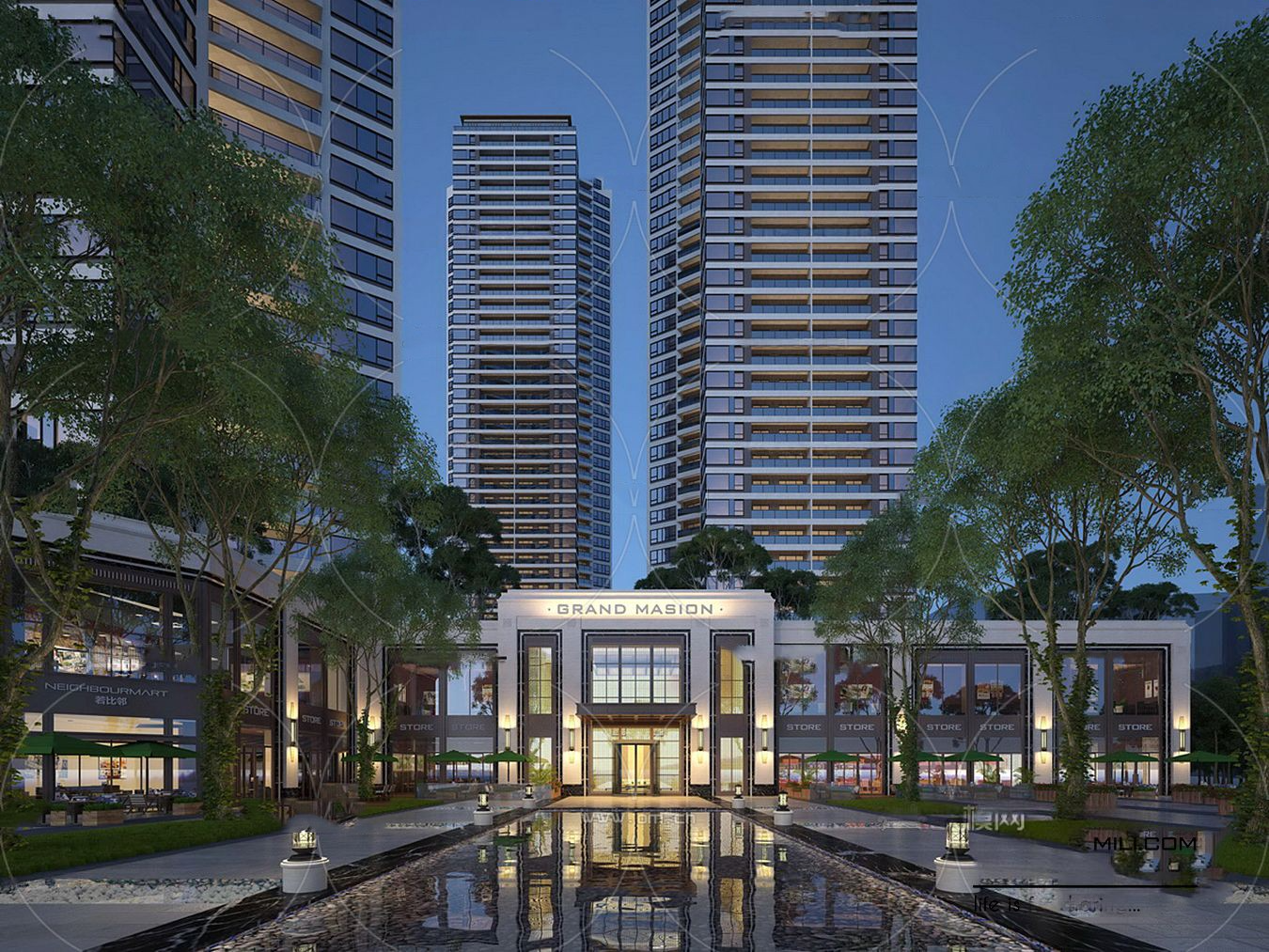 Grand Masion combines modern vertical living with the charm of classical grandeur. The symmetrical layout, anchored by the central pavilion with its reflective water feature, creates a welcoming and majestic entrance. The tall, sleek towers rising in the background symbolize progress and innovation, while the low-rise retail spaces at the base foster community and convenience.