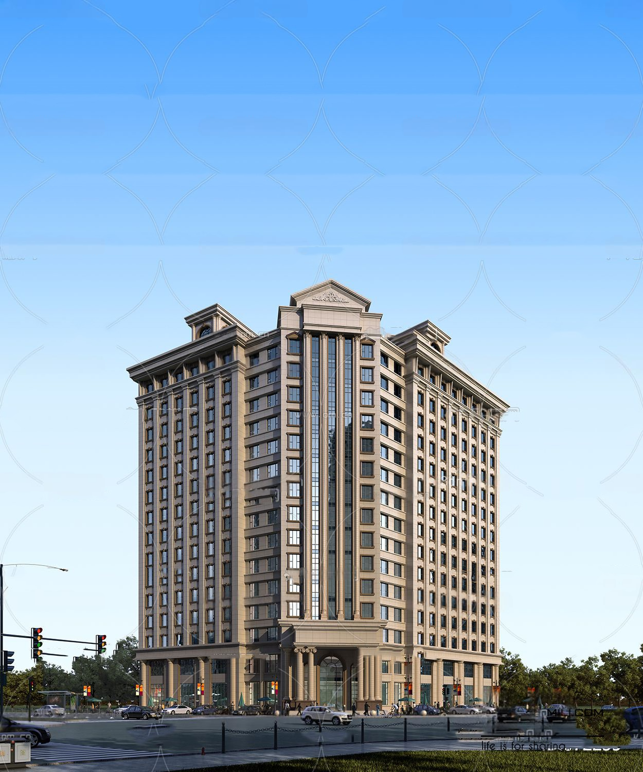 The arched central entrance serves as a welcoming yet stately focal point, exuding grandeur and refinement. Its strategic location at a prominent urban intersection ensures it becomes a landmark, blending functionality with architectural splendor.