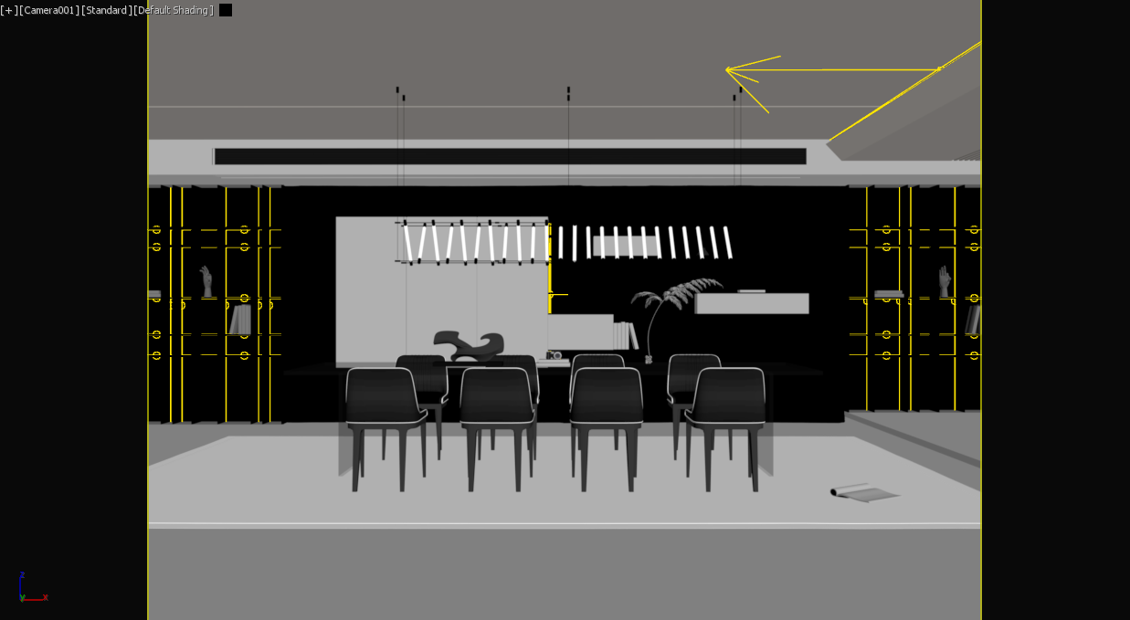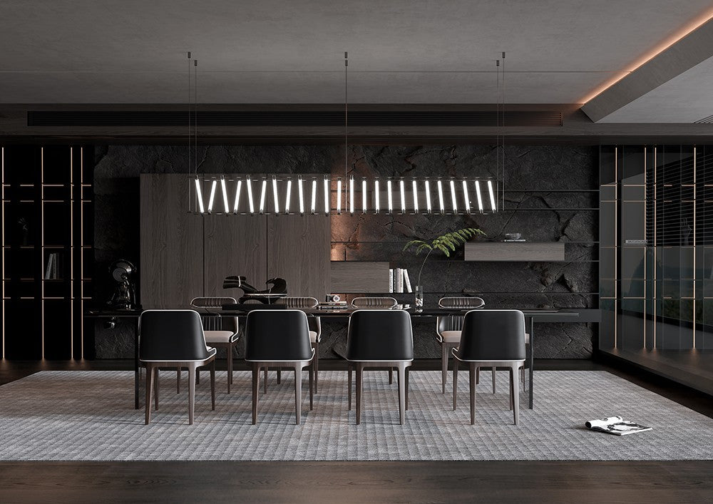 Linear Symmetry is a modern dining concept characterized by its clean lines and monochromatic tones. The elongated light fixture creates a visual rhythm, complementing the sleek dining chairs and textured rug. The natural stone wall adds depth and organic contrast to the room's geometric precision, while subtle greenery introduces a refreshing touch.