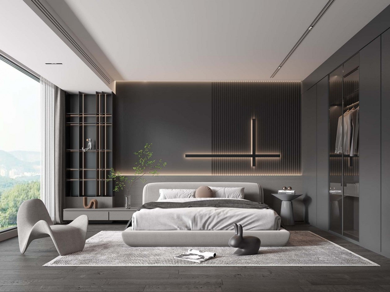 Lumen Solis, translating to "Light of the Sun," captures the essence of this refined bedroom retreat. The room balances structured modernity with soft organic forms, as seen in the curved upholstered bed and the sculptural chair. The illuminated slatted wall feature, with its cross-shaped lighting detail, evokes a sense of quiet reverence, almost like a modern altar to relaxation.