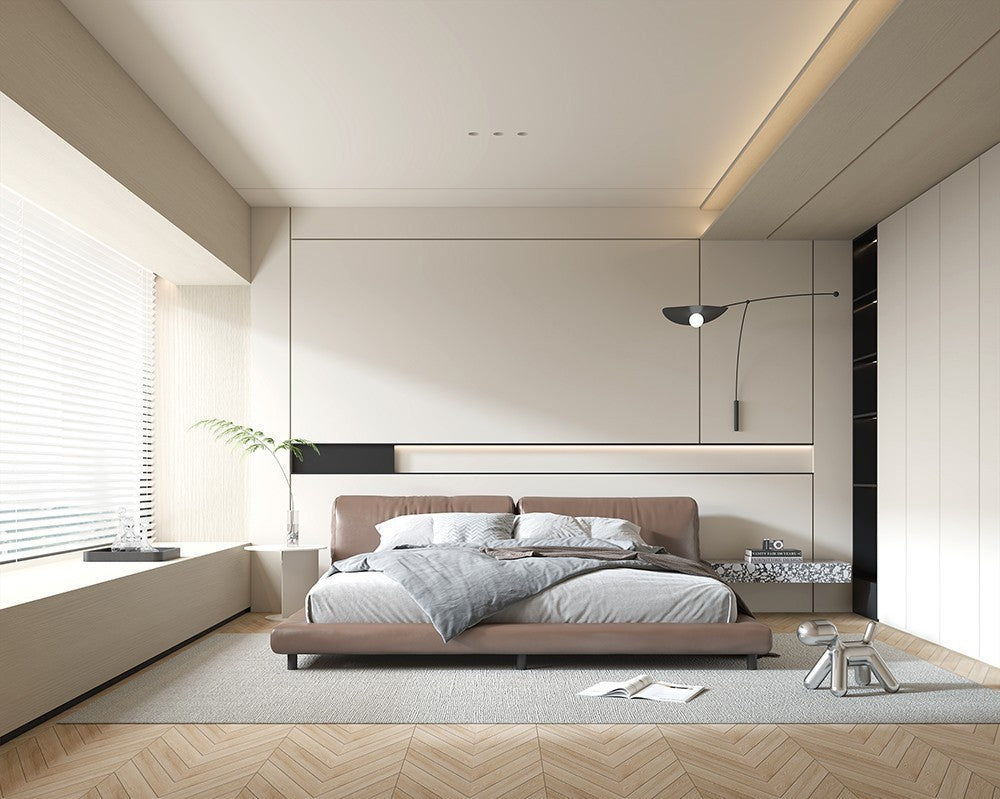 A quiet harmony unfolds in this space, where light and material whisper in a language of restraint. The bed, a sculptural presence in supple leather, is anchored against a wall of geometric purity—panel lines subtly shifting, creating depth in their precision. Above, the ceiling breathes with a soft glow, its recessed lighting tracing an unseen rhythm, a measured pulse of warmth against the pale expanse.