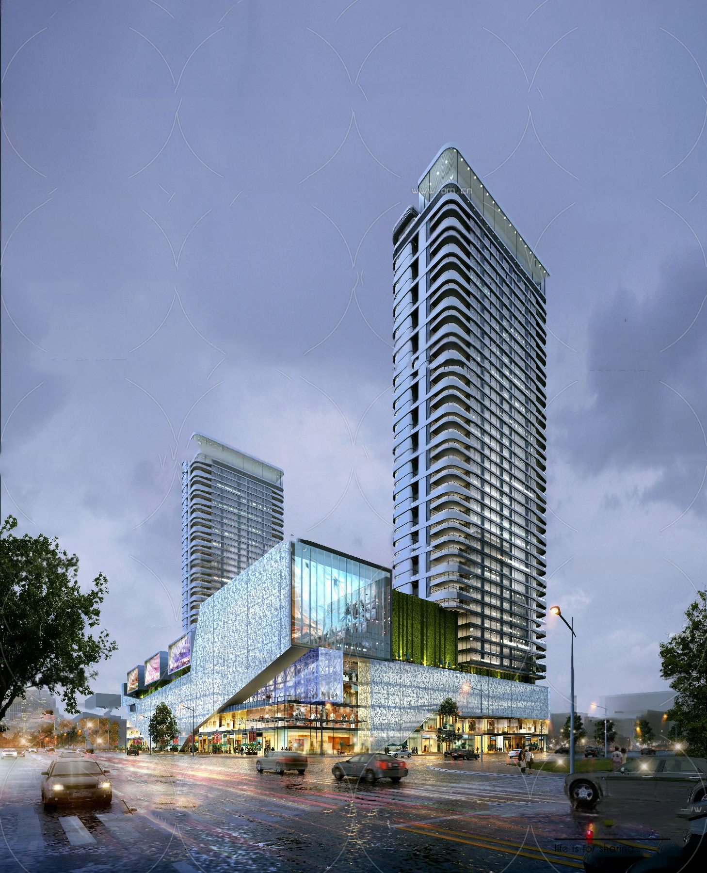 The soaring residential towers, with their curved balconies and floor-to-ceiling windows, offer panoramic city views and exude an aura of refinement. Vertical greenery and sustainable design elements, such as natural ventilation and energy-efficient lighting, enhance the connection between modern living and environmental consciousness.