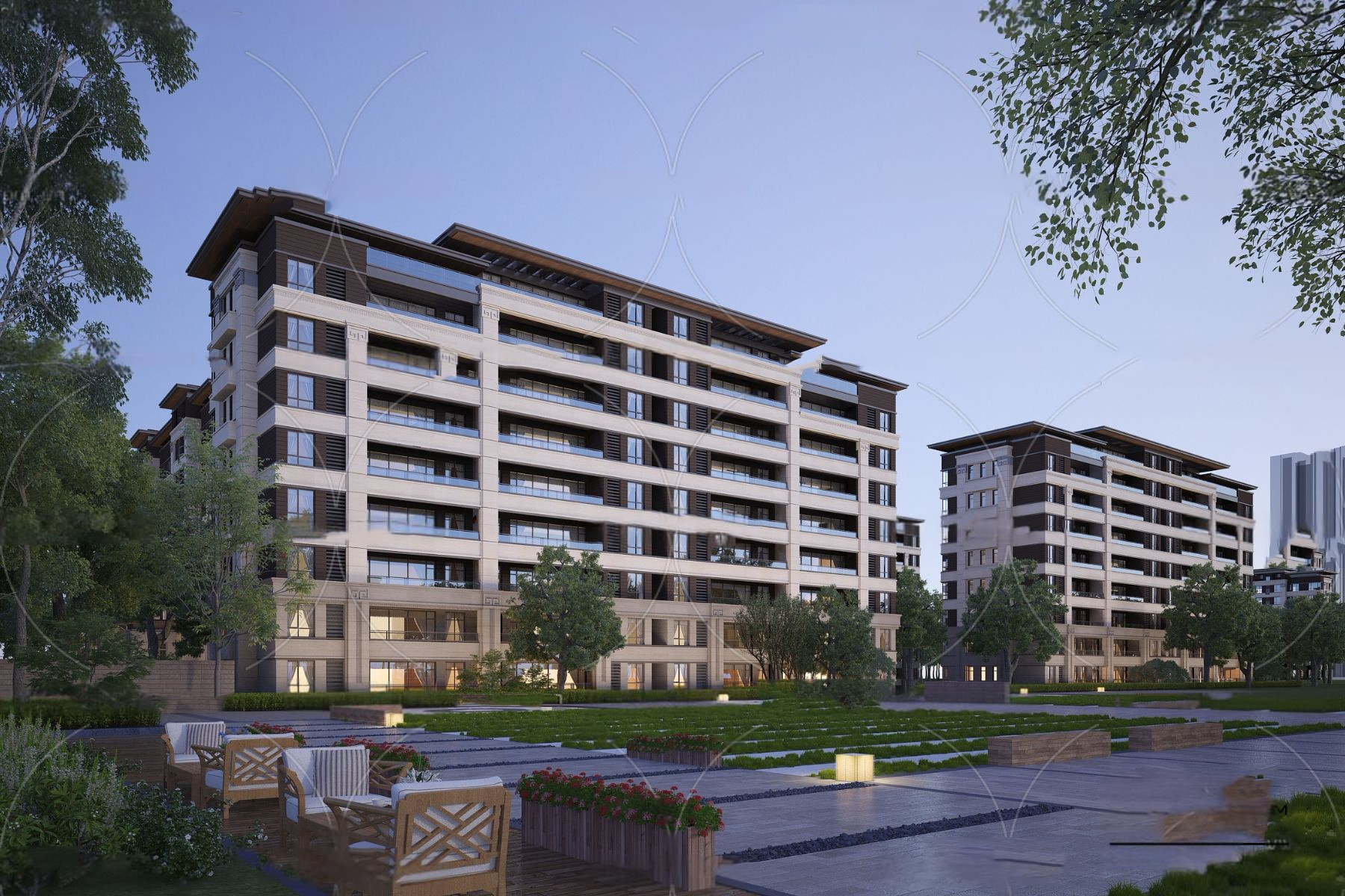 The surrounding landscaping complements the architectural rhythm, with wide green spaces and meticulously designed communal areas that foster a sense of community and tranquility. The placement of outdoor seating and pathways creates a dialogue between architecture and its environment, ensuring residents feel connected to both their home and nature.