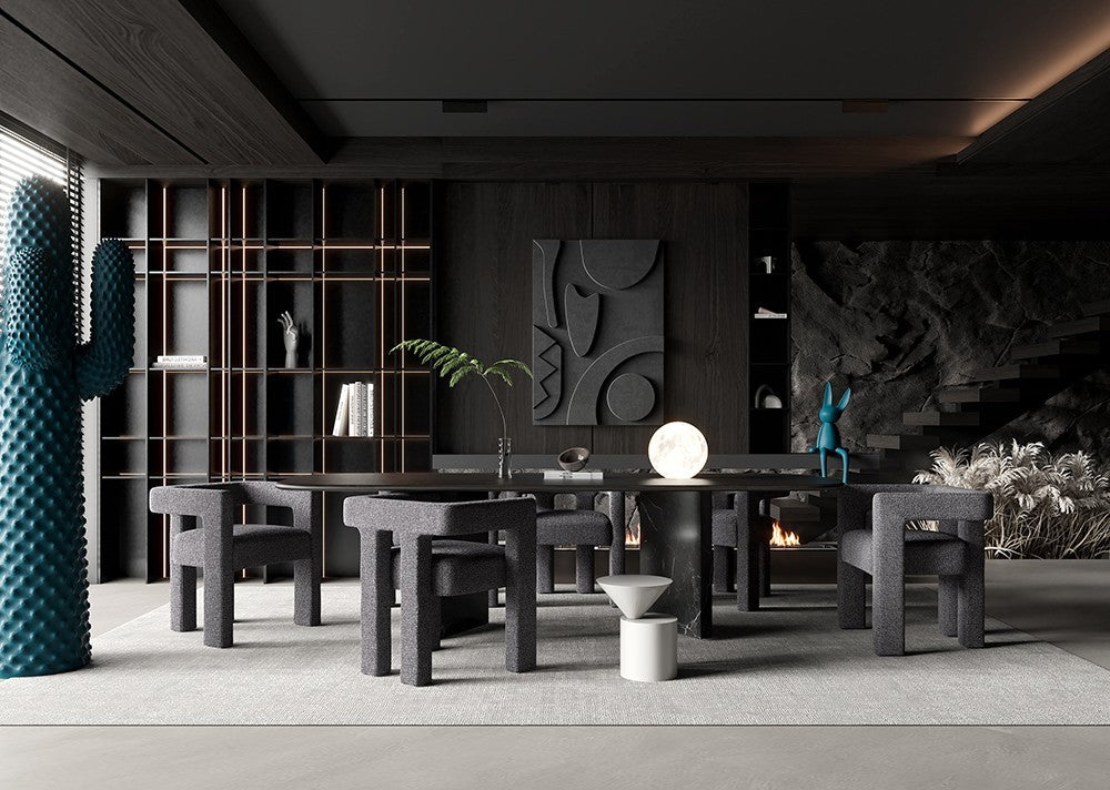 Lunar Harmony balances bold, sculptural furniture with earthy textures and minimalist geometry. The charcoal-grey dining set echoes strength and stability, while the glowing moon-like centerpiece brings warmth and softness, creating a contrast between nature and modernity.