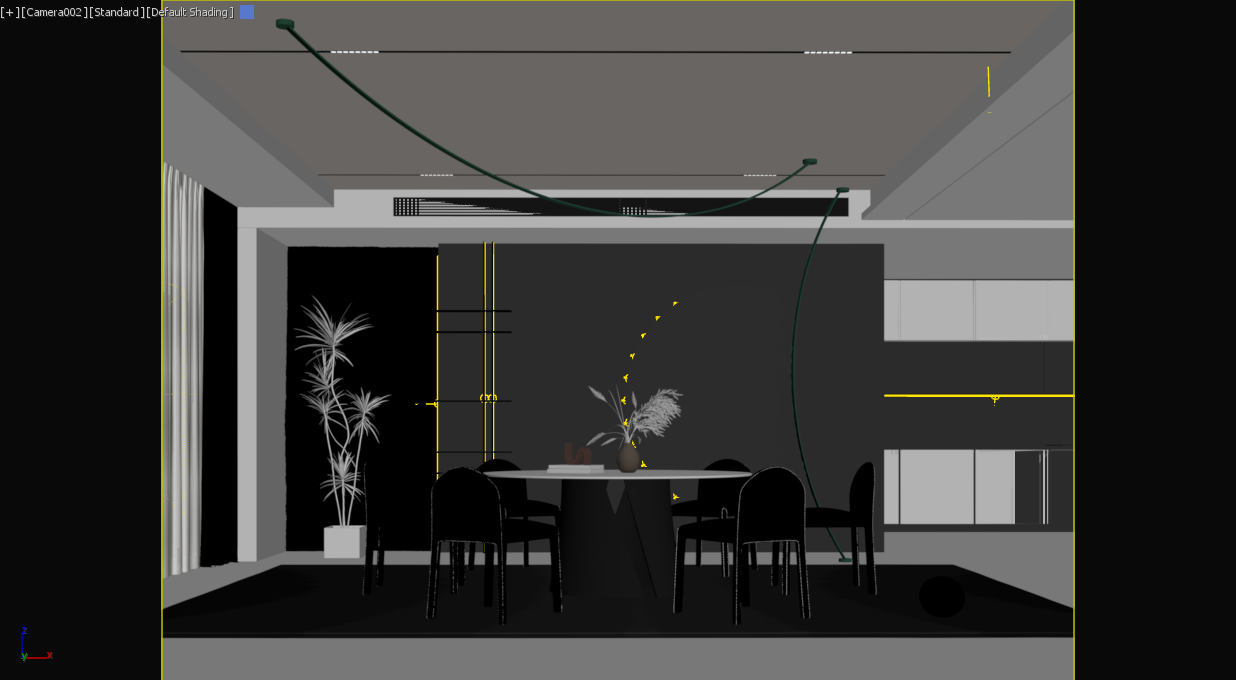 Subtle textures, such as the woven rug and the rough stone accent wall, bring depth and warmth, while the green cable light fixture introduces a dynamic, futuristic energy to the otherwise serene setting. The interplay of light and shadow enhances the room's sculptural elements, creating a harmonious balance between boldness and tranquility.