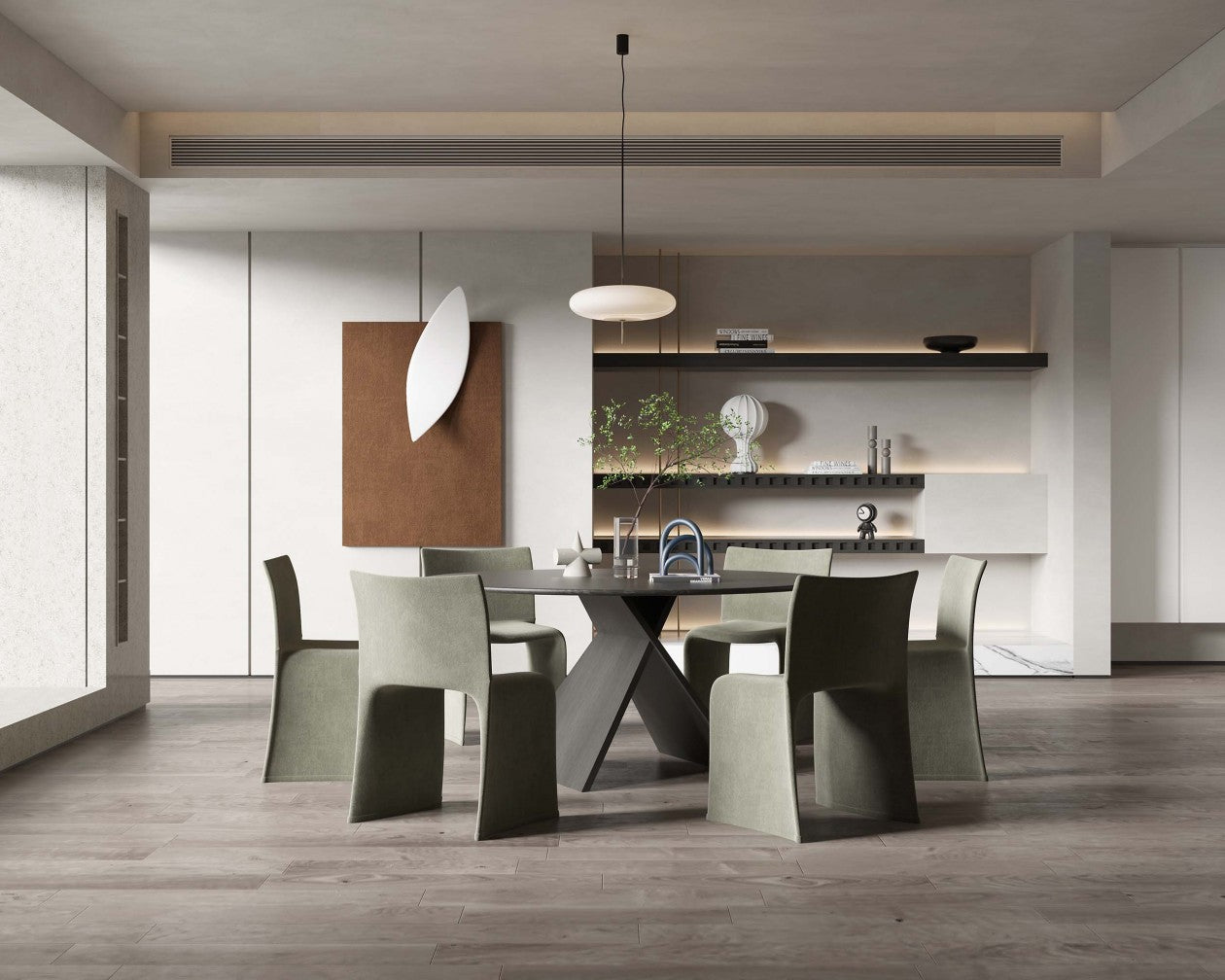 Modern Essence is a sophisticated dining room concept that merges form and function. The angular black dining table contrasts harmoniously with the soft, muted green chairs, while the textured wall art introduces depth. The pendant light creates a gentle focus, offering both utility and style.