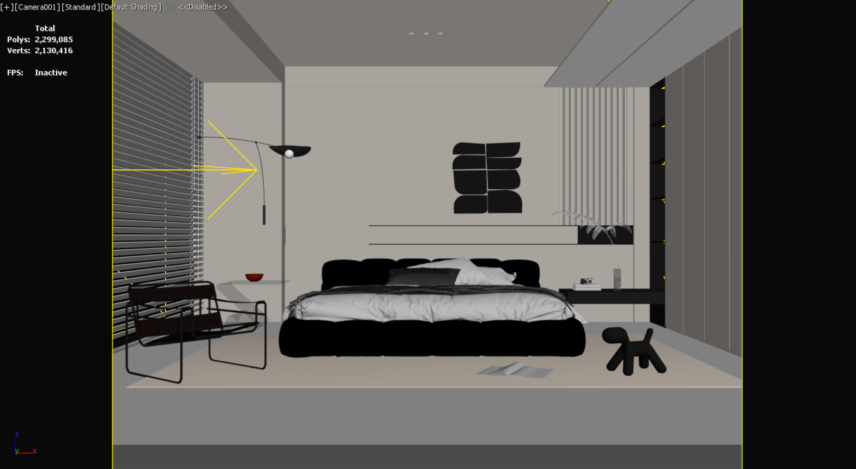 Nivis Aequilibrium exudes an air of balance and clarity, where sharp geometric accents meet soft, inviting textures. The white, tufted bed takes center stage, evoking both comfort and modern sophistication. Surrounding it, monochromatic elements like the black wall sculpture and marble console create visual rhythm, adding depth to the neutral palette.