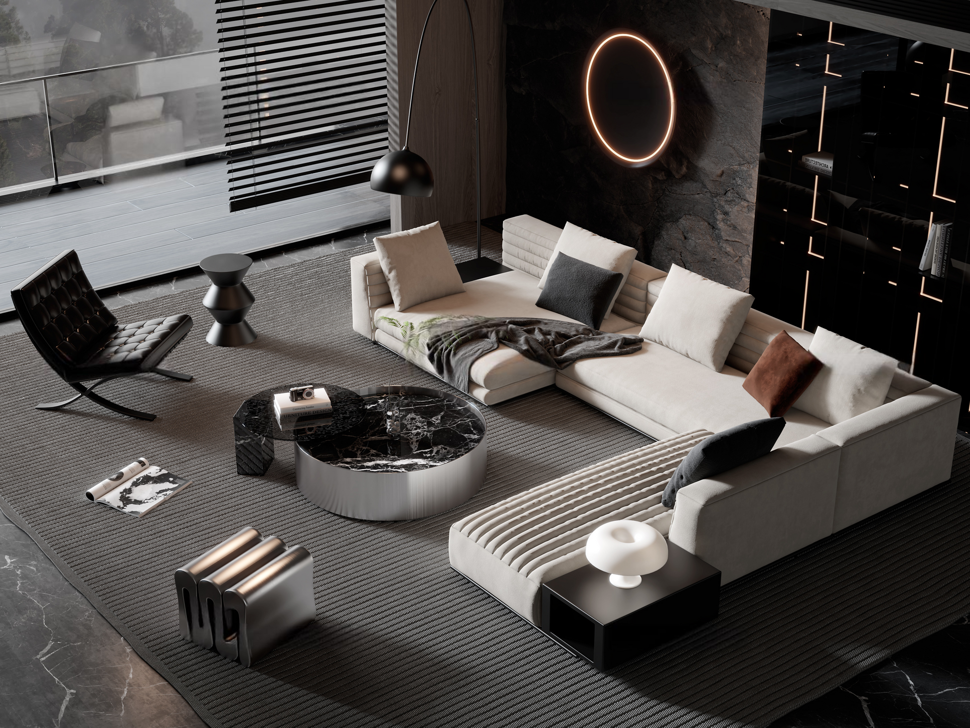 A modular sectional sofa, adorned with neutral cushions, anchors the room, inviting relaxation and conversation. In the center, a striking duo of black marble tables with metallic finishes serves as a focal point, reflecting the ambient lighting that softly illuminates the space. A sculptural chair, geometric stools, and a statement floor lamp add layers of sophistication, making each element a work of art in itself.