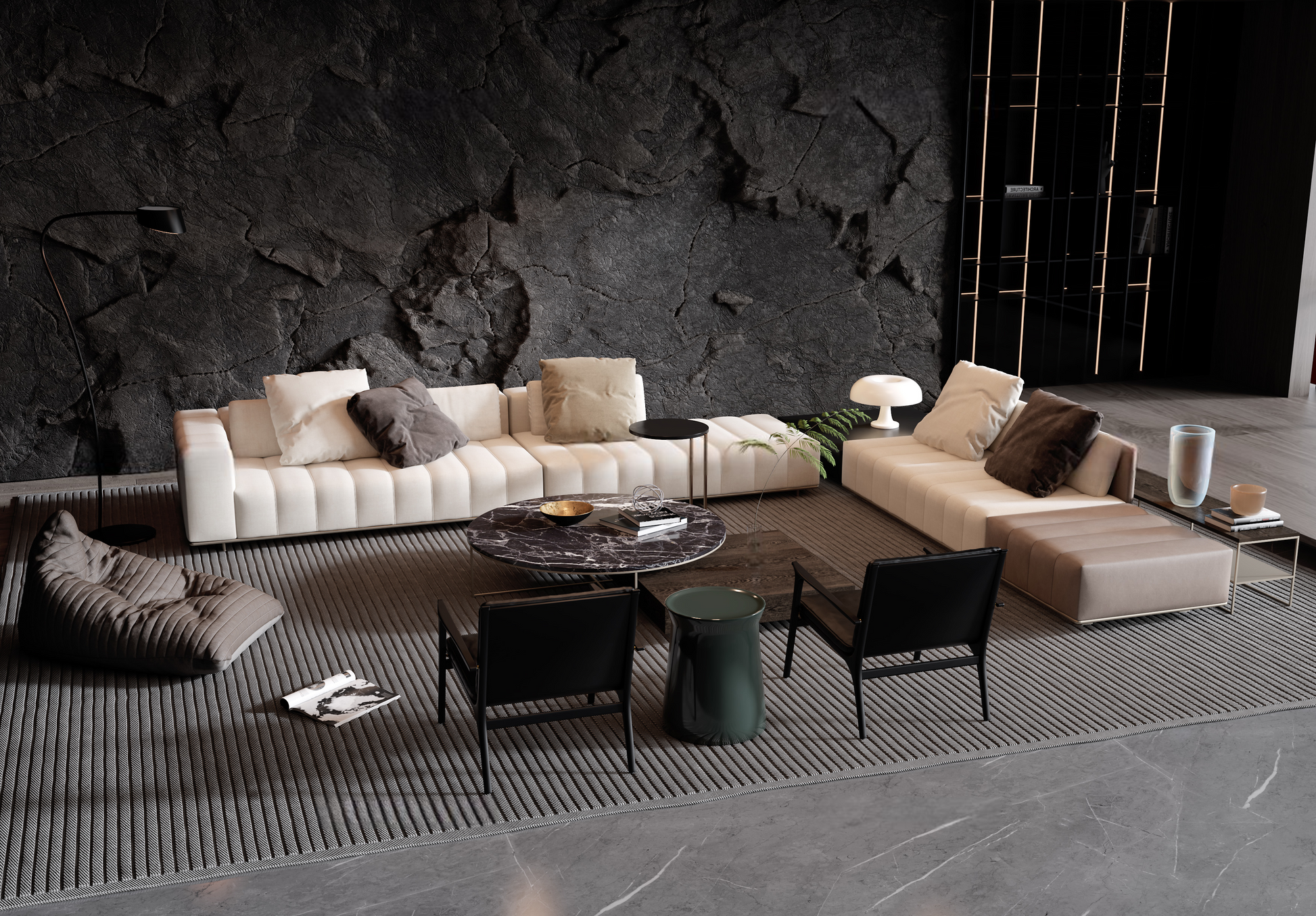 At its heart, a textured basalt wall looms like a sculptural monolith, its deep crevices and organic patterns evoking the passage of time. This bold backdrop is softened by the gentle contrast of plush, channel-tufted seating in shades of ivory and sand, offering both visual relief and an inviting sense of comfort.