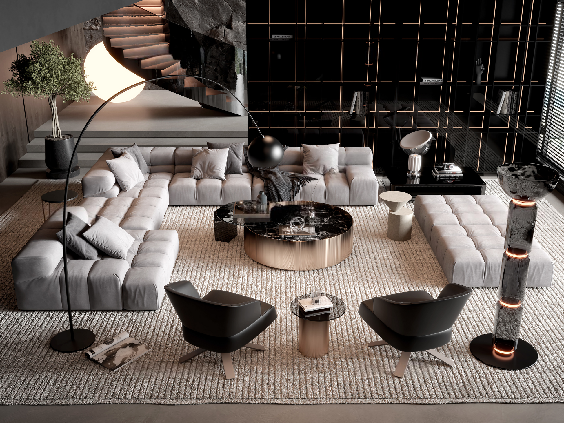 The plush, modular seating arrangement envelops the space in an inviting embrace, its pillowed texture offering both structure and relaxation. A sleek marble coffee table, framed by brushed gold accents, anchors the composition, harmonizing with the geometric symmetry of the dark, grid-like shelving unit—a bold architectural statement that adds depth and intrigue.