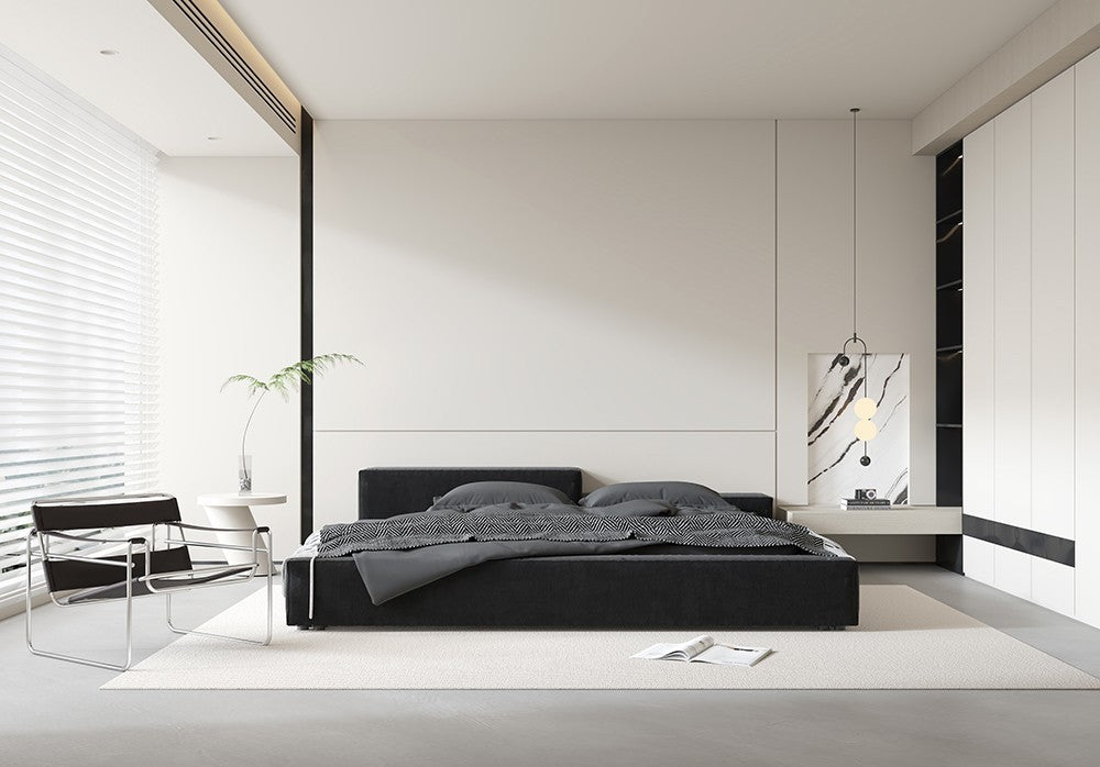 Obscura Lucis is a study in contrasts, emphasizing the interplay between light and dark. The bold black bed frame anchors the space, providing a dramatic focal point, while the surrounding light tones on the walls and furniture offer a sense of openness and clarity. The marble art panel adds a touch of luxury and texture, perfectly paired with the sculptural pendant light for an artistic edge.