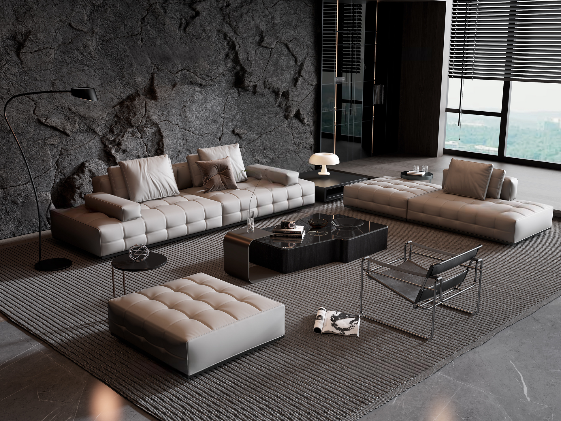 The floor is adorned with a deep charcoal woven rug, its texture mimicking the stratifications of stone. A low-profile ottoman, mirroring the sofa’s tufted aesthetic, extends the lounge’s modular adaptability, ensuring that every element is both sculptural and functional.