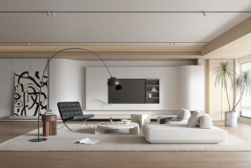 The vast openness is softened by undulating forms—walls that curve rather than dictate, light that pools rather than commands. A monochrome artwork leans effortlessly, its bold strokes a counterpoint to the room’s stillness, while a single arc of black metal—an homage to movement—casts a glow that stretches with time. The furnishings remain low, grounded, inviting a sense of ease.