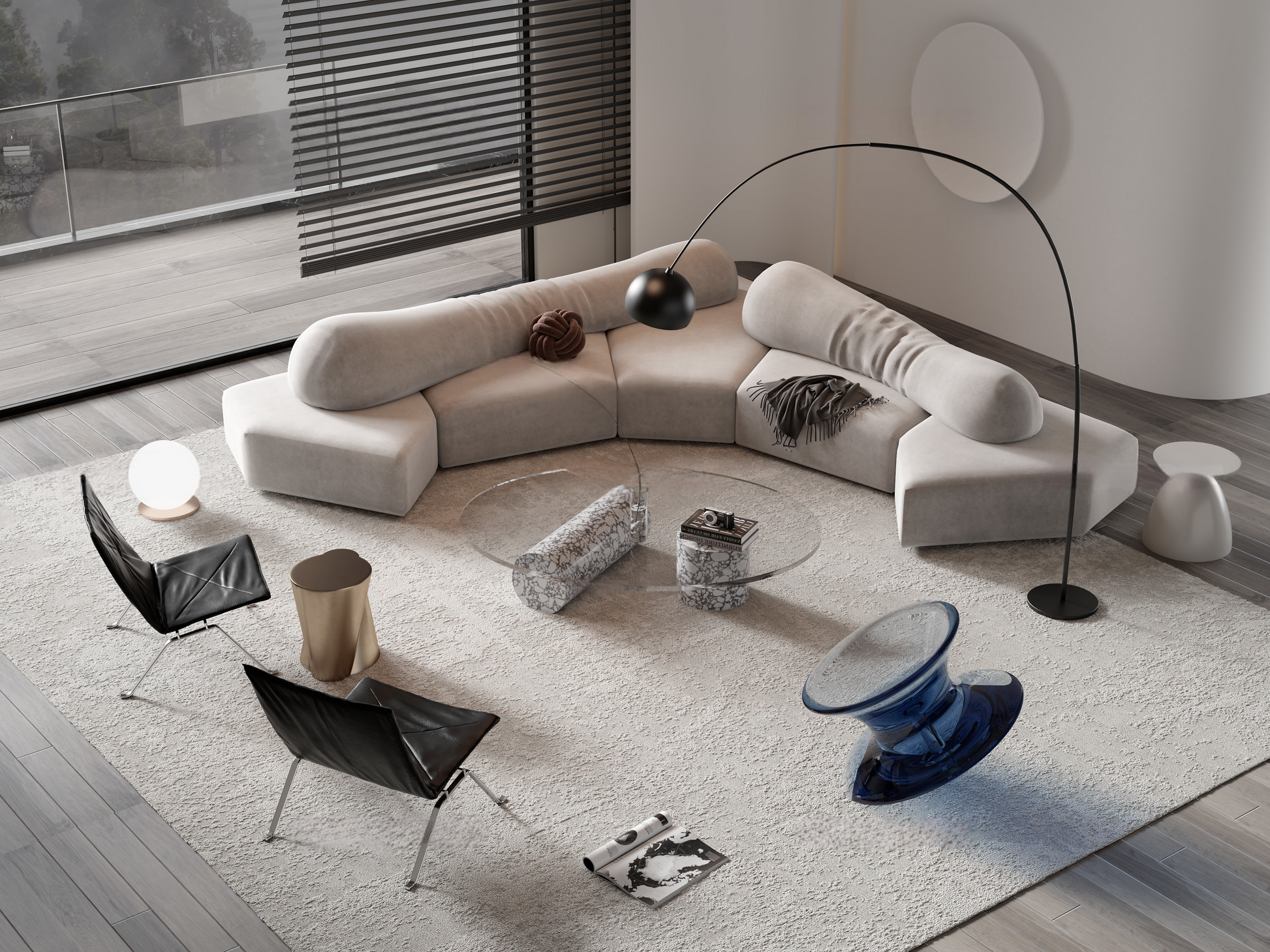 The composition of materials is equally intentional—transparent glass tables with cylindrical marble bases lend a weightless quality, while the interplay of metallics and natural textures provides contrast. The black leather lounge chairs, with their angular steel frames, introduce a structured counterpoint to the organic softness of the sofa. Overhead, an arched floor lamp gracefully bridges the space, echoing the curved language of the furniture.