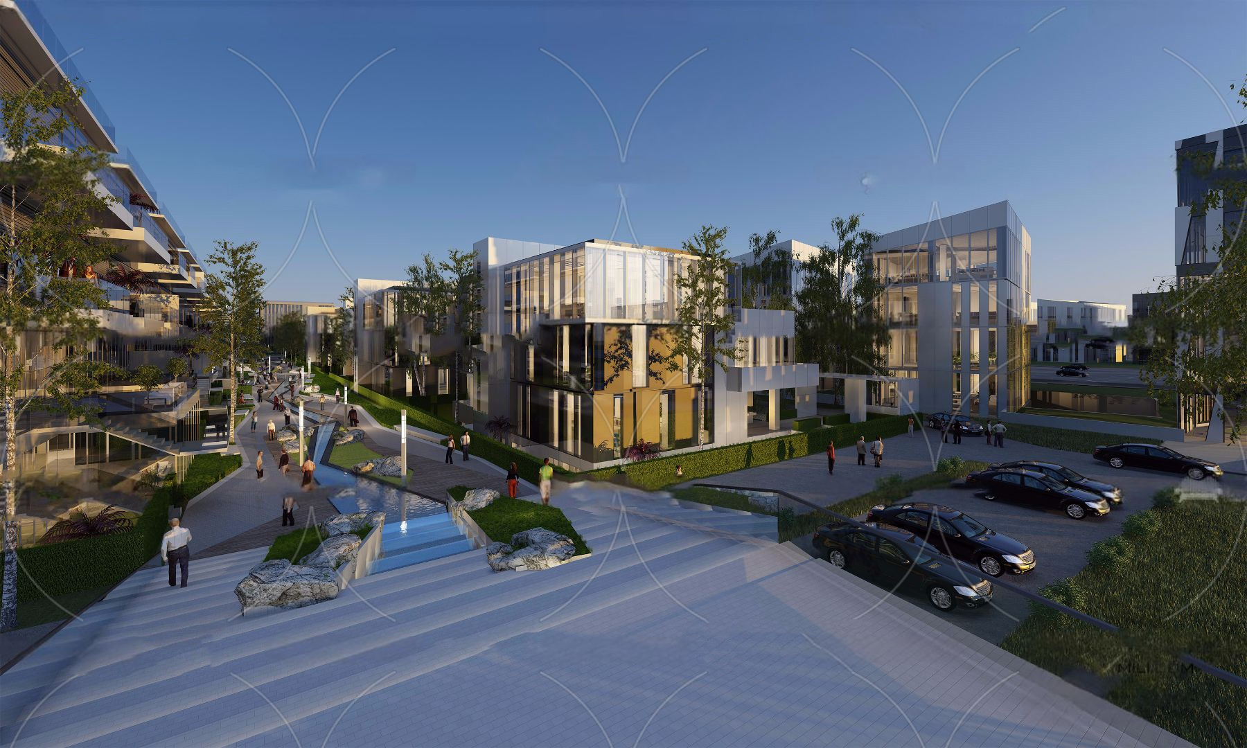 The central walkway serves as the spine of the development, linking homes, leisure areas, and community spaces. The cascading water features and carefully placed seating areas foster a serene yet vibrant atmosphere, encouraging residents to connect with their environment and each other.