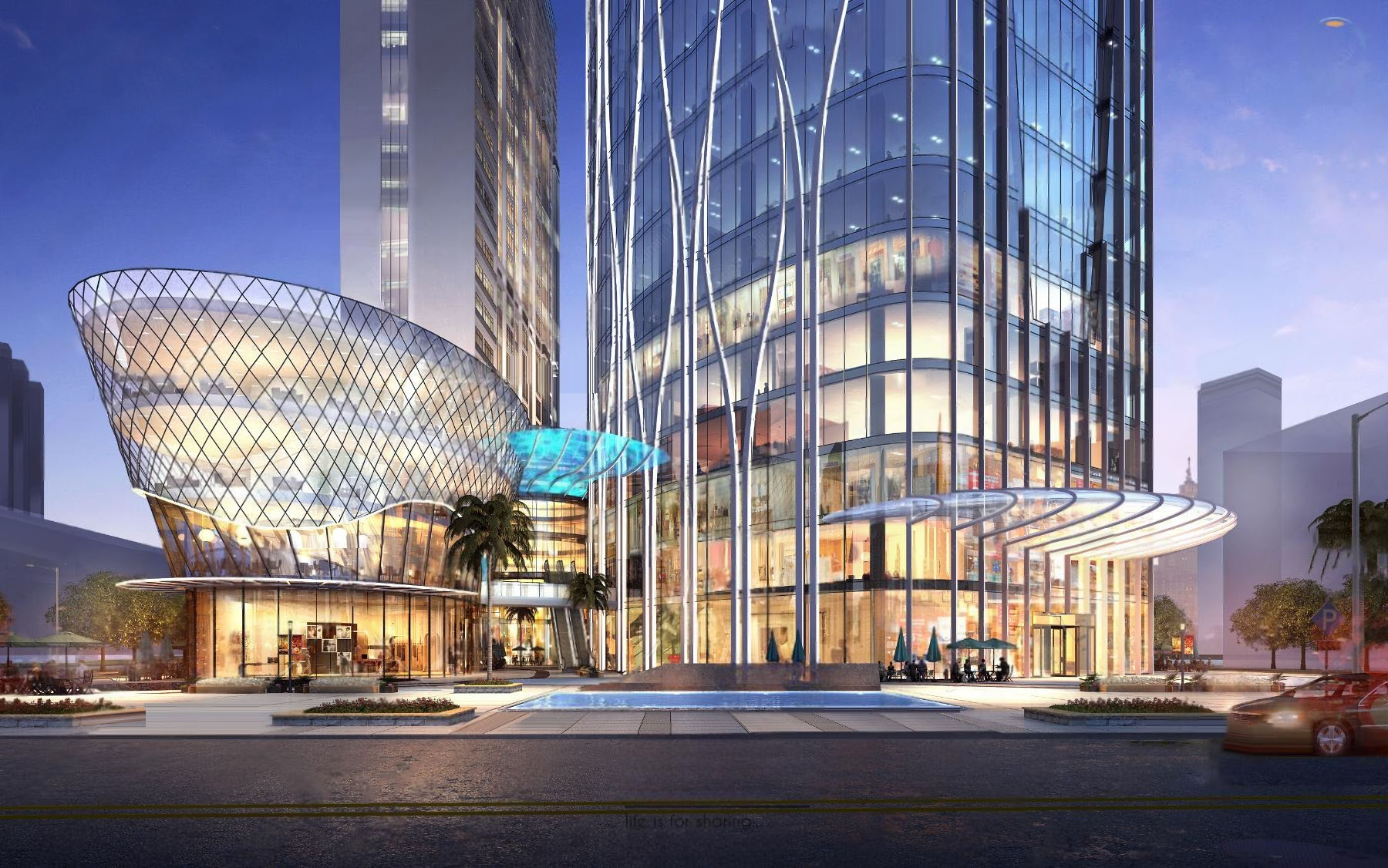 The design integrates seamlessly with its surroundings, offering expansive spaces for commercial, recreational, and cultural activities. At night, the illuminated structure transforms into a beacon of innovation, representing the pinnacle of urban sophistication.